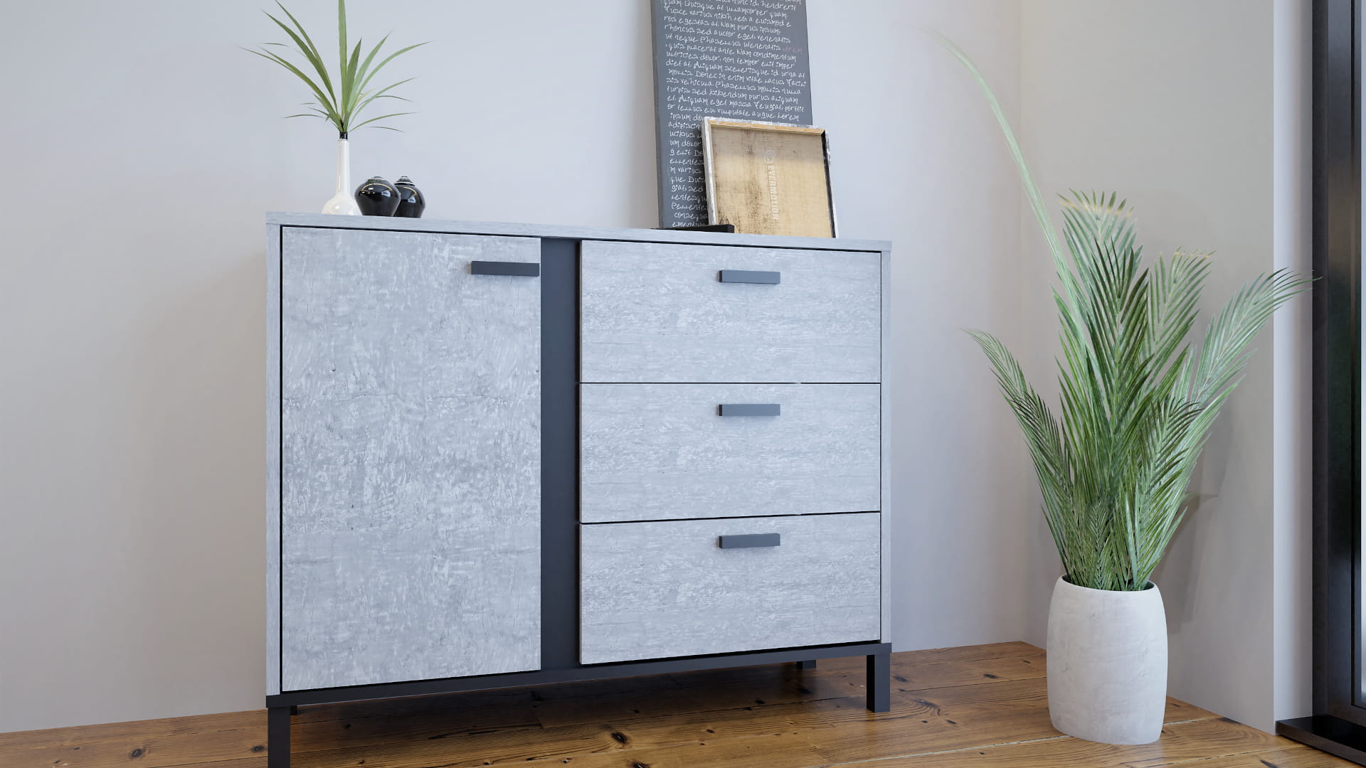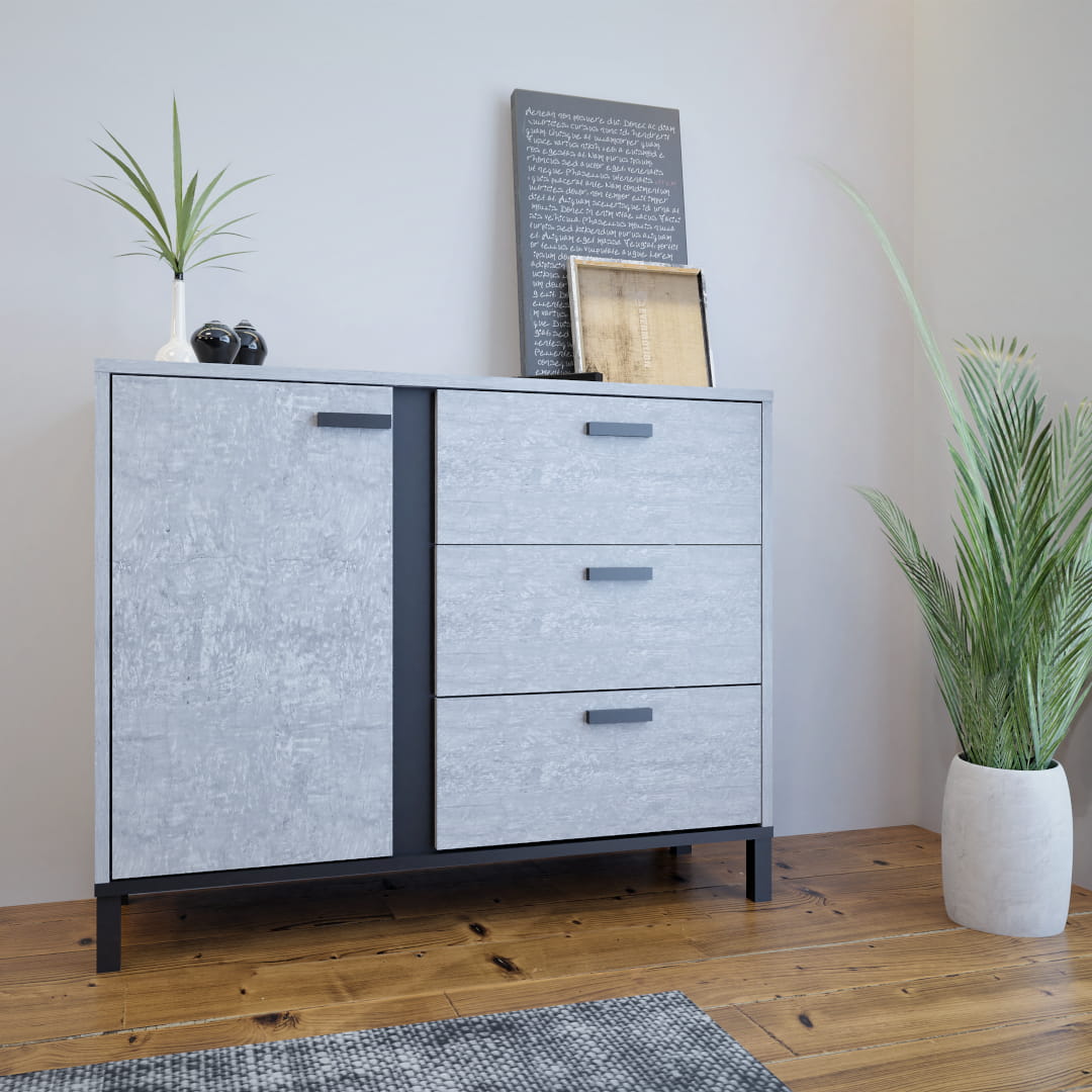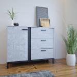 Komoda do salonu Brilo kolor Beton - 3 szuflady, wysokie czarne nóżki, szerokość 100 cm