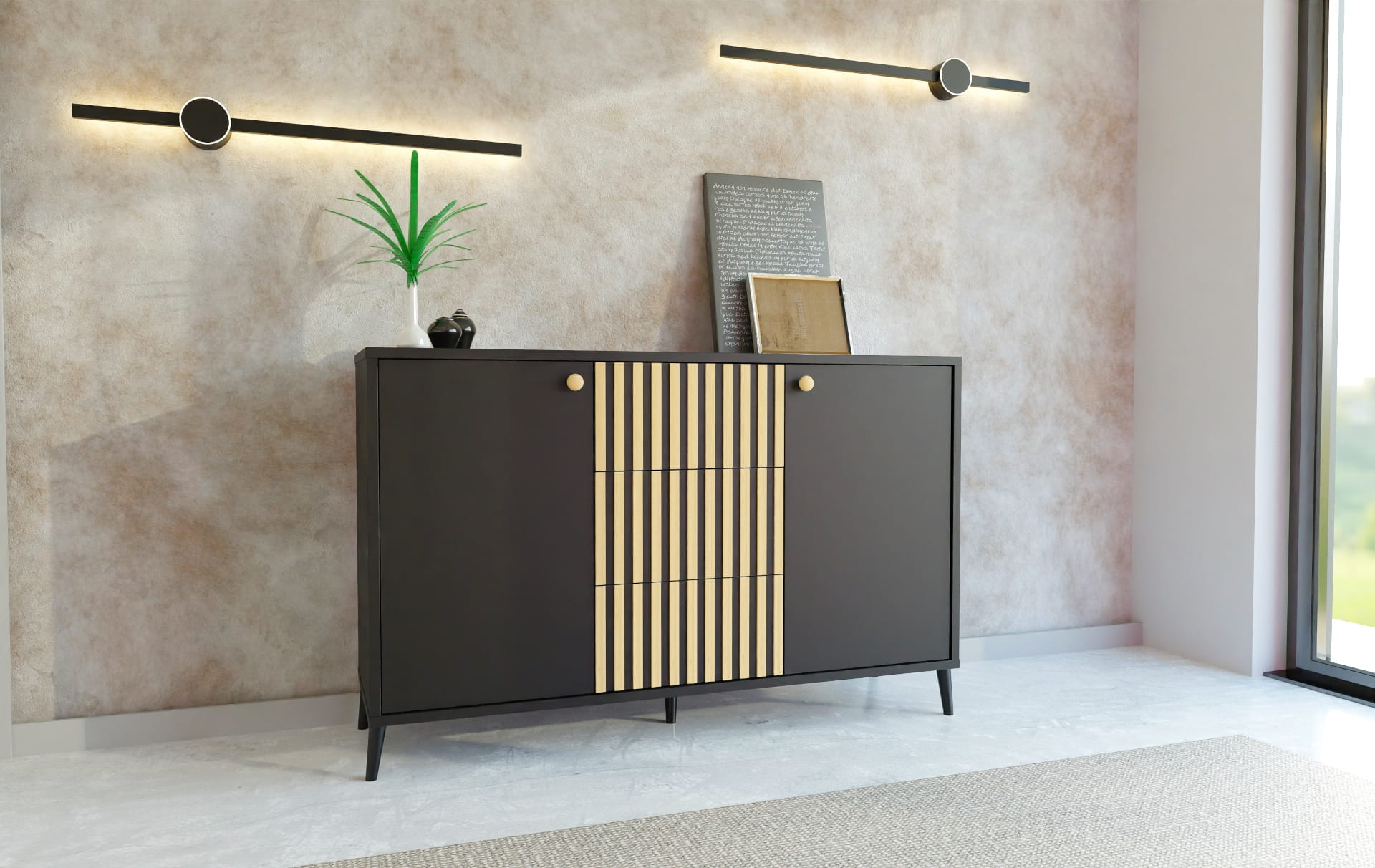 Komoda do salonu Fado Czarna na wysokich czarnych nóżkach - 3 szuflady / 120×90x35 cm / lamele artisan / uchwyty buk