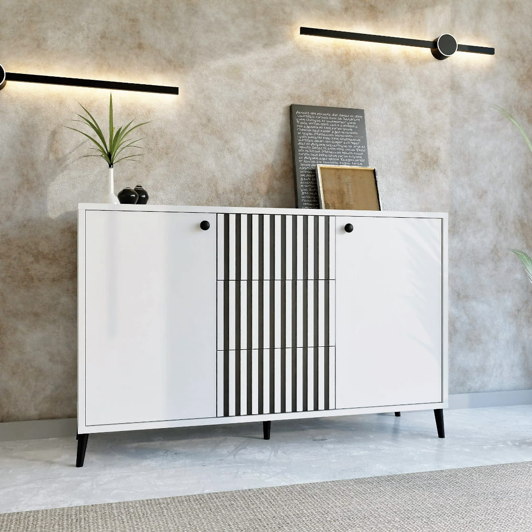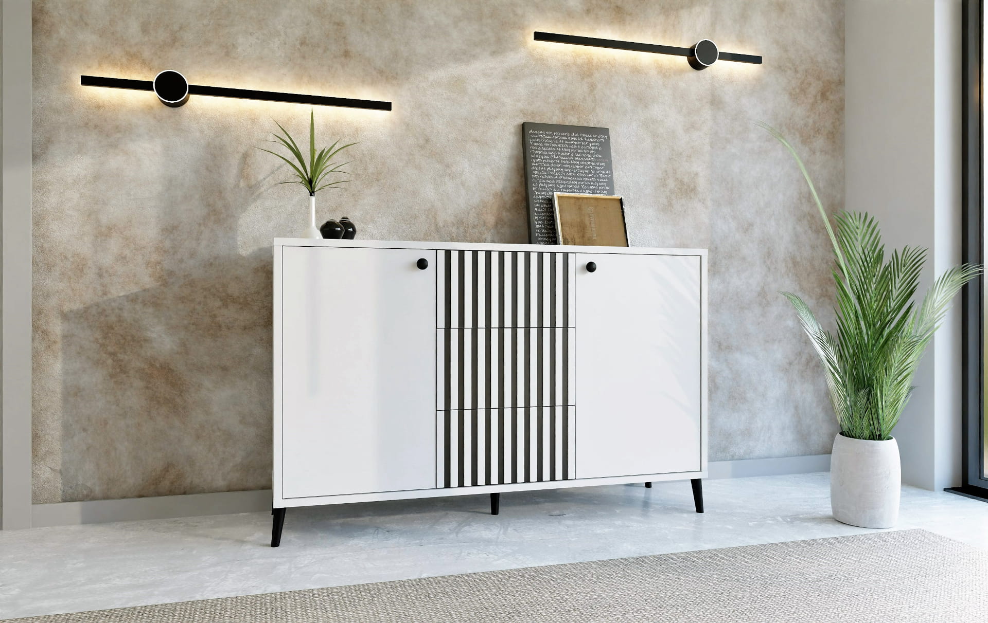 Komoda do salonu Ikar Biały-Czarny na wysokich czarnych nóżkach - 120×93×35 cm / front z lamelami, uchwyty czarne