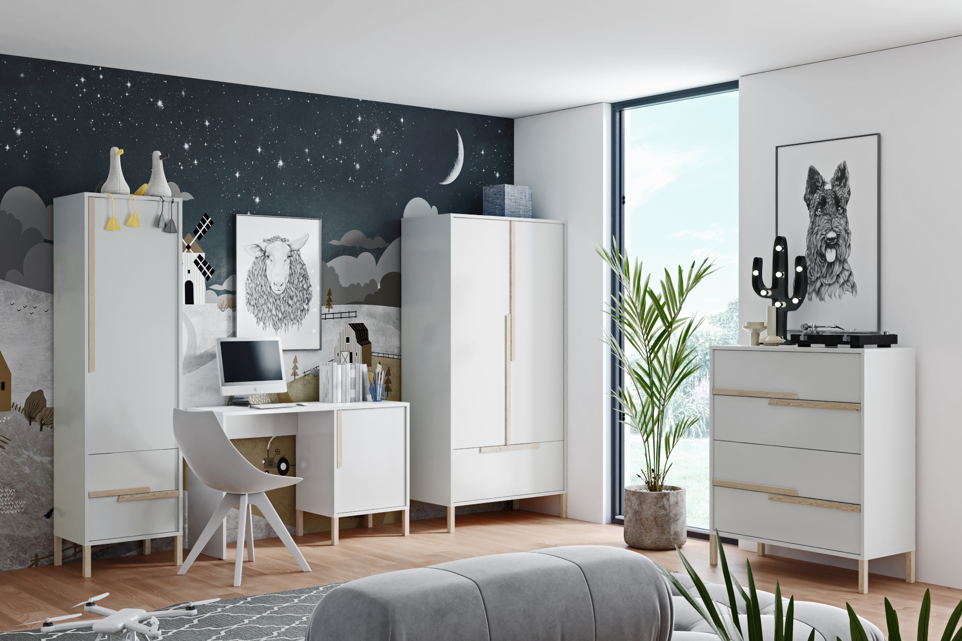 Regał łączy funkcjonalność z nowoczesnym stylem , który trafia do gusta nastolatka ,łączy otwarte półki ekspozycyjne z zamykanymi frontami lub szufladami może pełnić funkcje biblioteczki twojej pociechy .