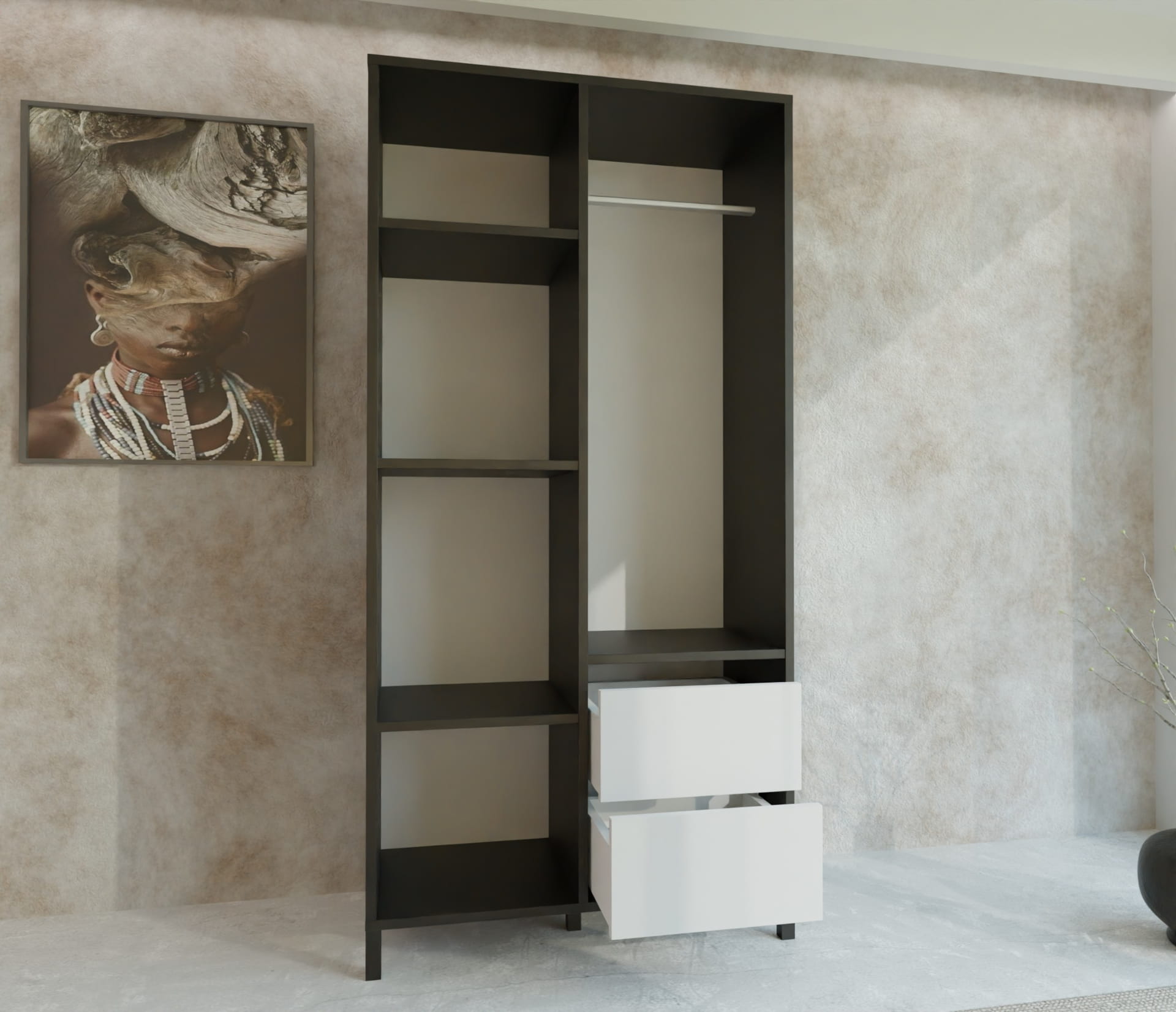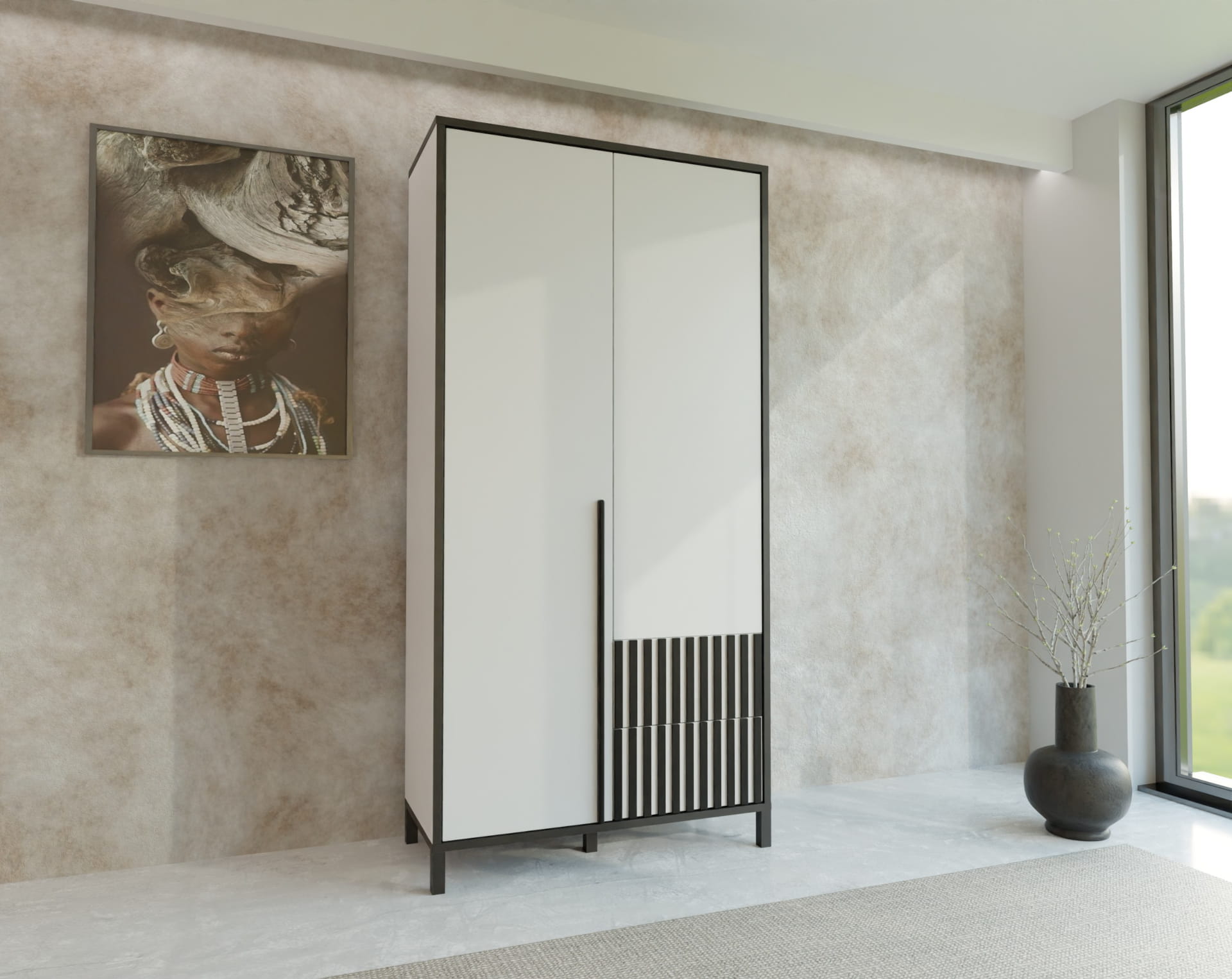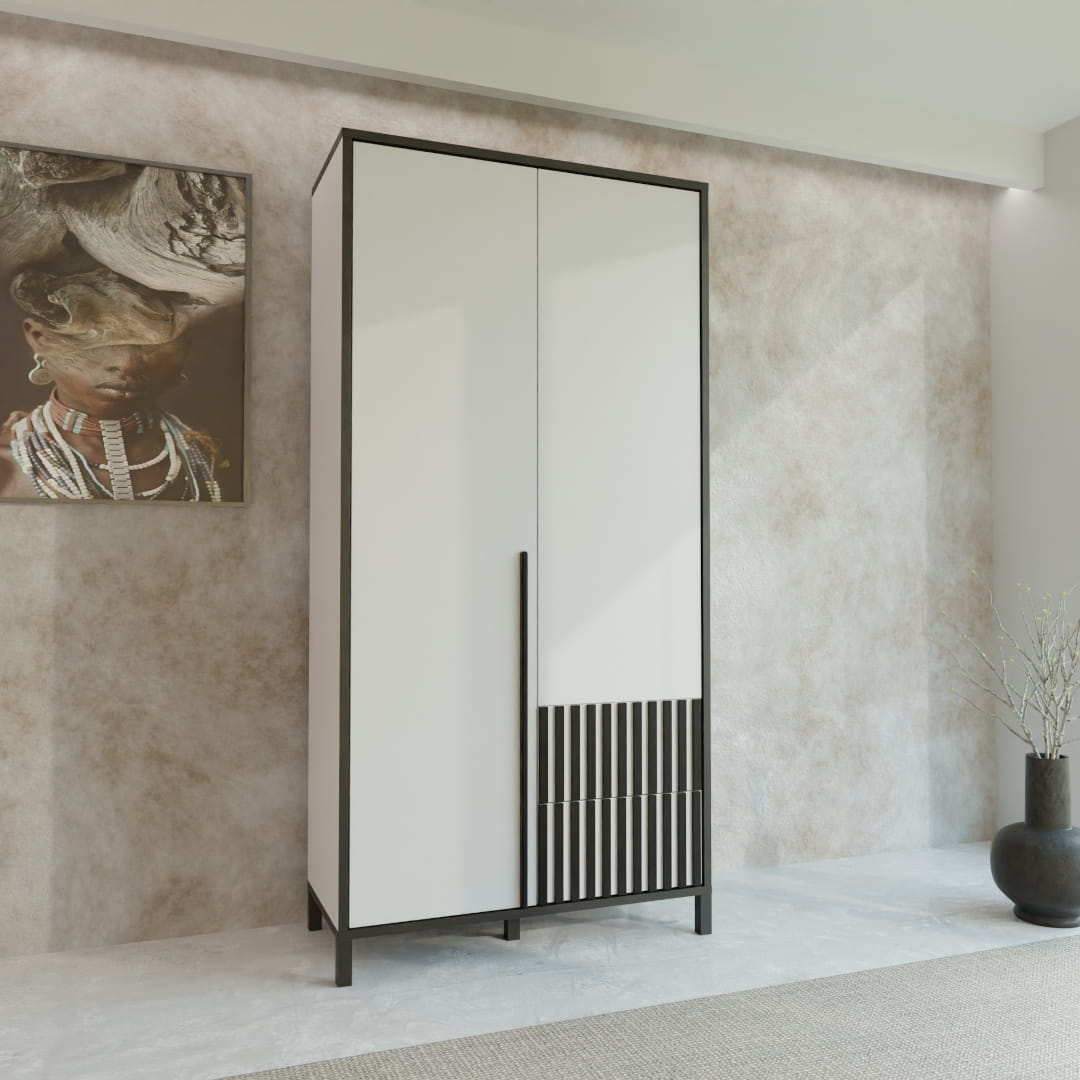 Szafa Agnar 2D Biała z czarnymi lamelami - 2-drzwiowa / 2-szuflady / 206×81×50 cm / uchwyty czarne / wysokie czarne nóżki