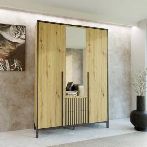 Szafa Agnar 3D Artisan z czarnymi lamelami i lustrem - 3 drzwiowa / 2 szuflady / 206×120×50 cm / uchwyty czarne / wysokie czarne nóżki