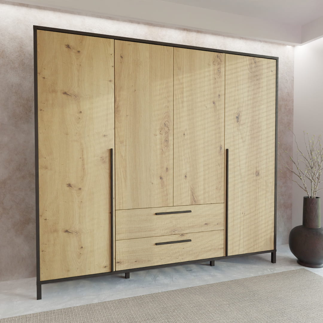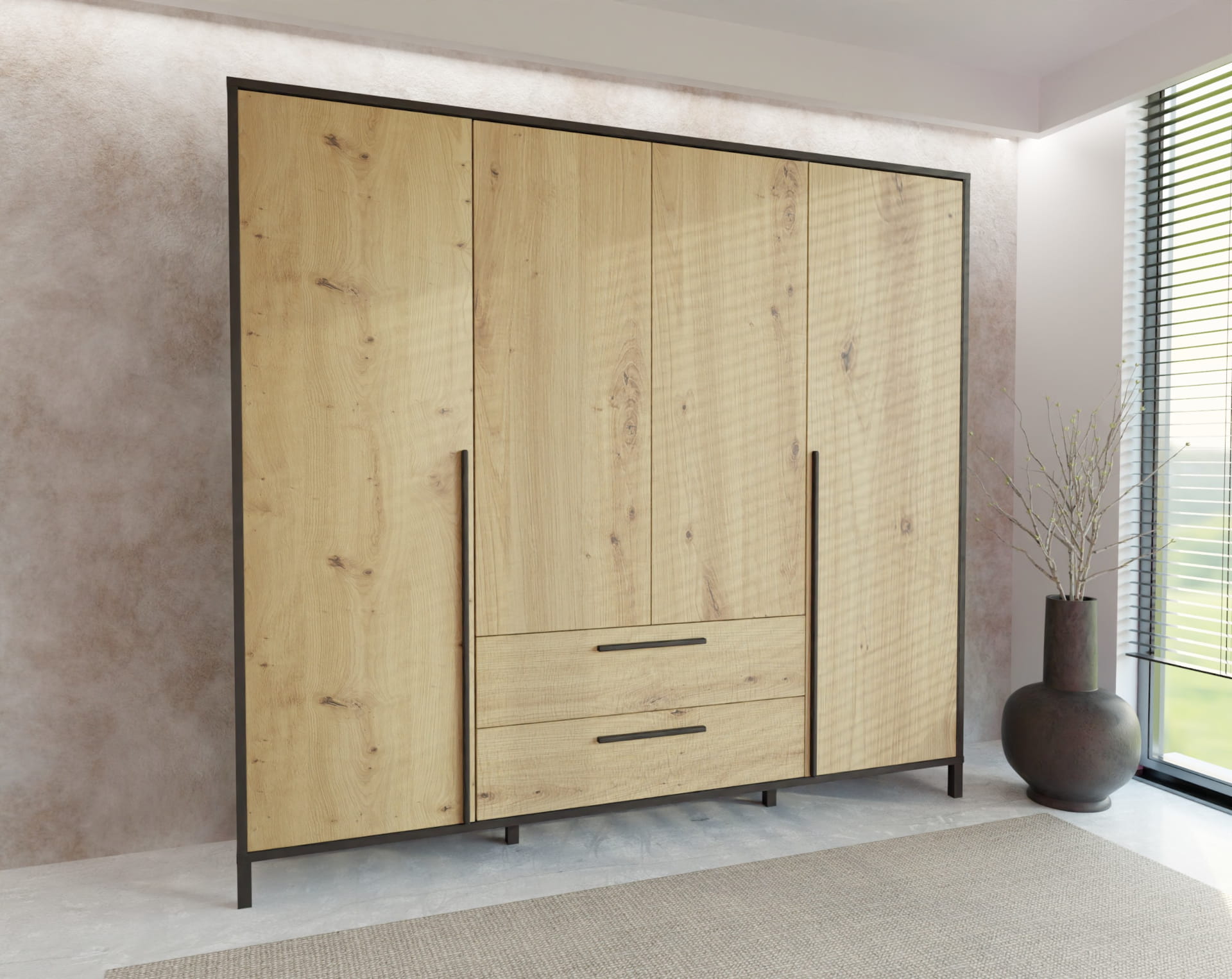 Szafa Vito 4D Artisan gładka - 4 drzwiowa / 2 szuflady / 206×160×50 cm / czarne uchwyty lamel / wysokie czarne nóżki