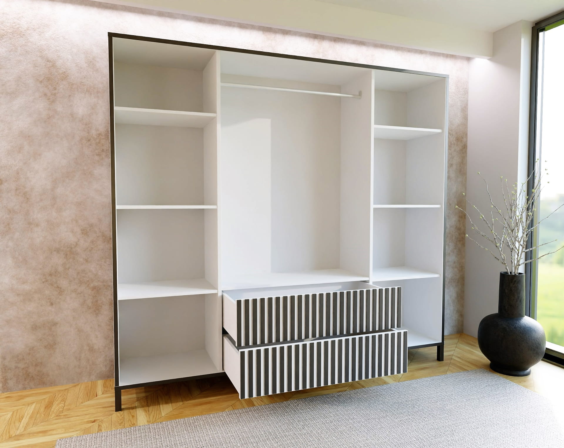 SZAFA VITO POJEMNA I NOWOCZESNA SZAFA ,W PEŁNI WYPOSAŻONA (DRAŻKI ,PÓŁKI ,SZUFLADY )DEKORY W FORMIE LAMELI NA SZUFLADACH NADAJE SZAFIE ELEGANCJI ,DZIĘKI SWOJEJ STYLISTYCE NADAJE CHAREKRTERU POMIESZCZENIU