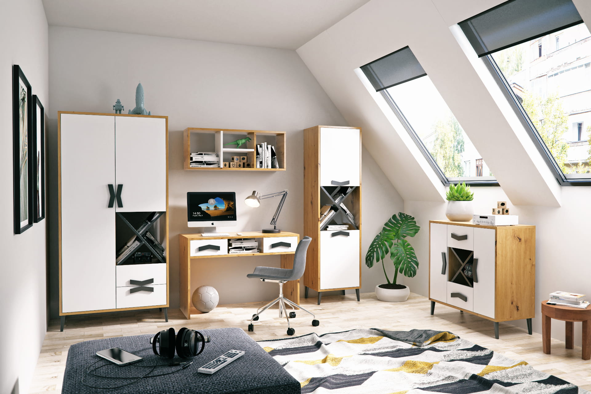 SZAFA HIX jest uzupełnieniem zestawu/meblościanki HIX będącego nowoczesną propozycją w kategorii mebli pokojowych młodzieżowych charakteryzując się eleganckim w swojej prostocie wzornictwem brył. Dzięki modułowej budowie Szafa HIX jest idealnym rozwiązaniem tak do mniejszych jak i przestronnych wnętrz.