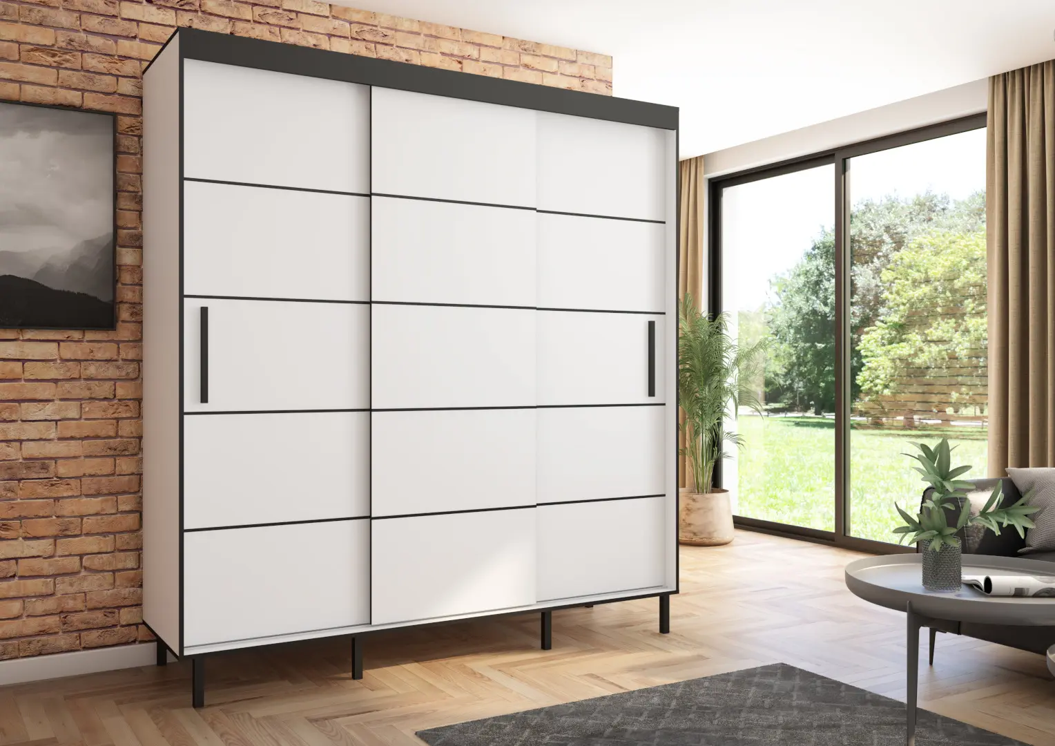 Szafa przesuwna Braga 205, Biała, Czarne listwy