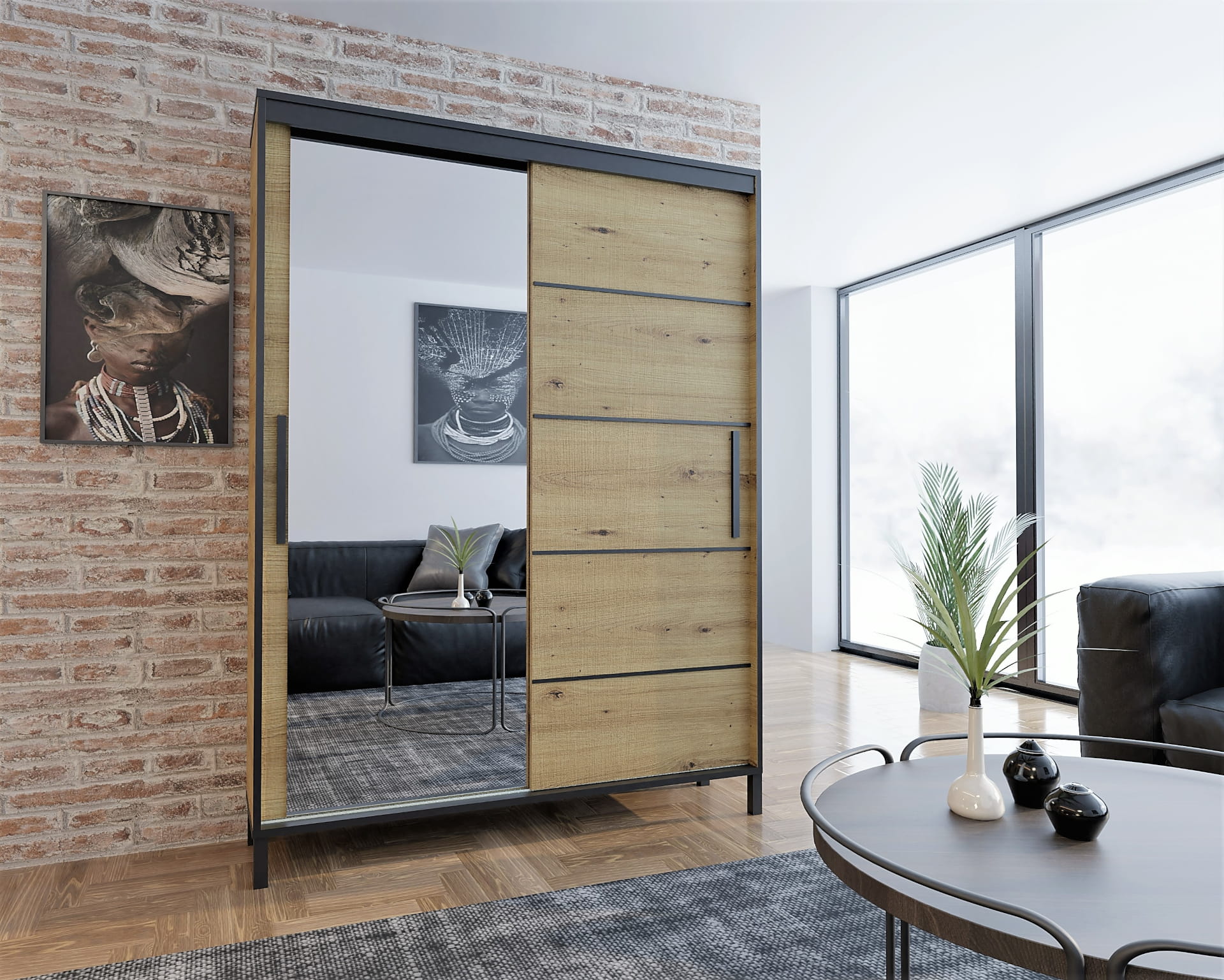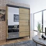 Szafa przesuwna Braga Artisan z lustrem i czarnymi listwami 120 cm - wysoka 221 cm / głęb. 60 cm / wysokie czarne nóżki, czarny uchwyt, oświetlenie led