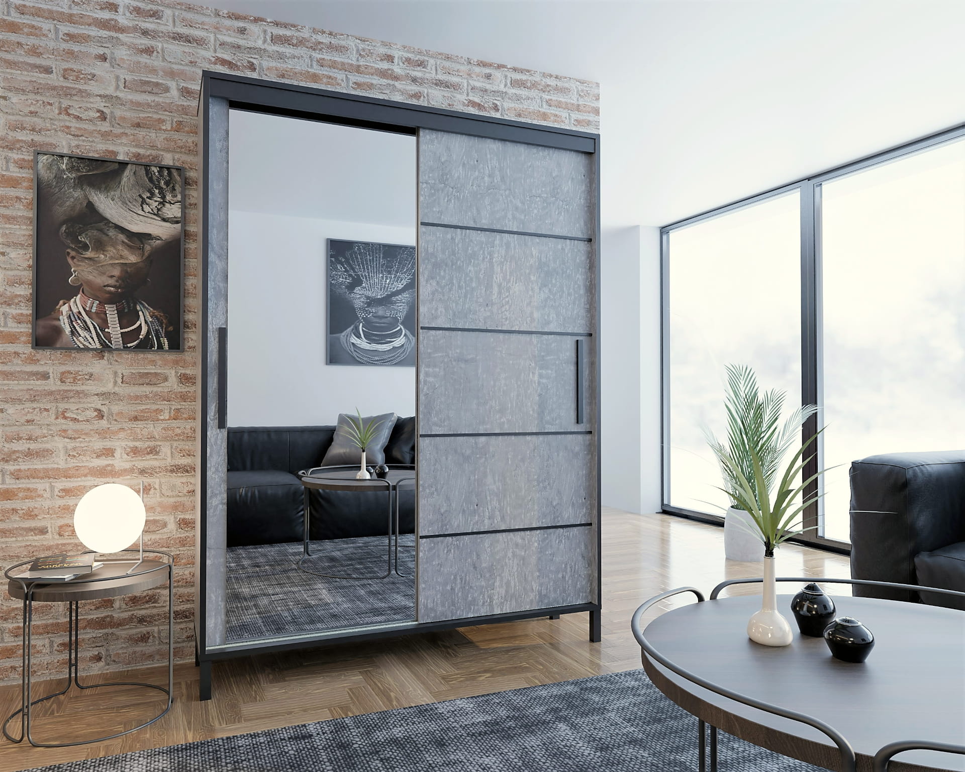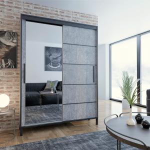 Szafa przesuwna Braga Beton z lustrem i czarnymi listwami 120 cm - wysoka 221 cm / głęb. 60 cm / wysokie czarne nóżki, czarny uchwyt, oświetlenie led
