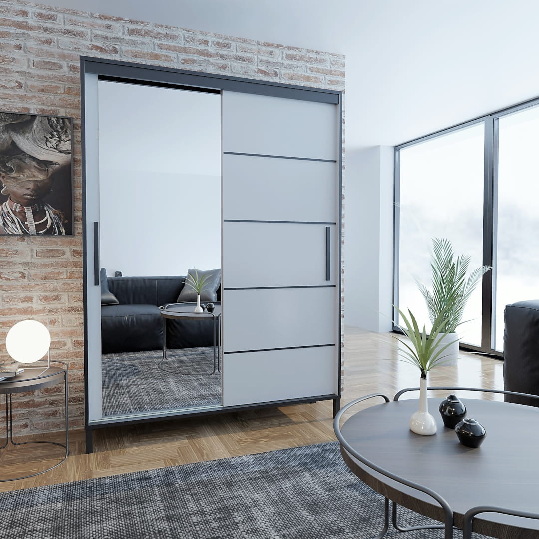 Szafa przesuwna Braga Biała z lustrem i czarnymi listwami 120 cm - wysoka 221 cm / głęb. 60 cm / wysokie czarne nóżki, czarny uchwyt, oświetlenie led