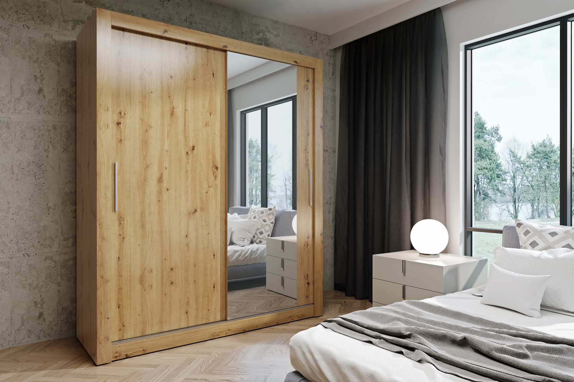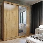 Szafa przesuwna ubraniowa Monako Artisan gładka 160 cm - 2 drzwiowa, 200×160×64 cm / 1 lustro 185x60 / uchwyty drewniane, oświetlenie led