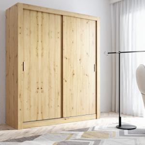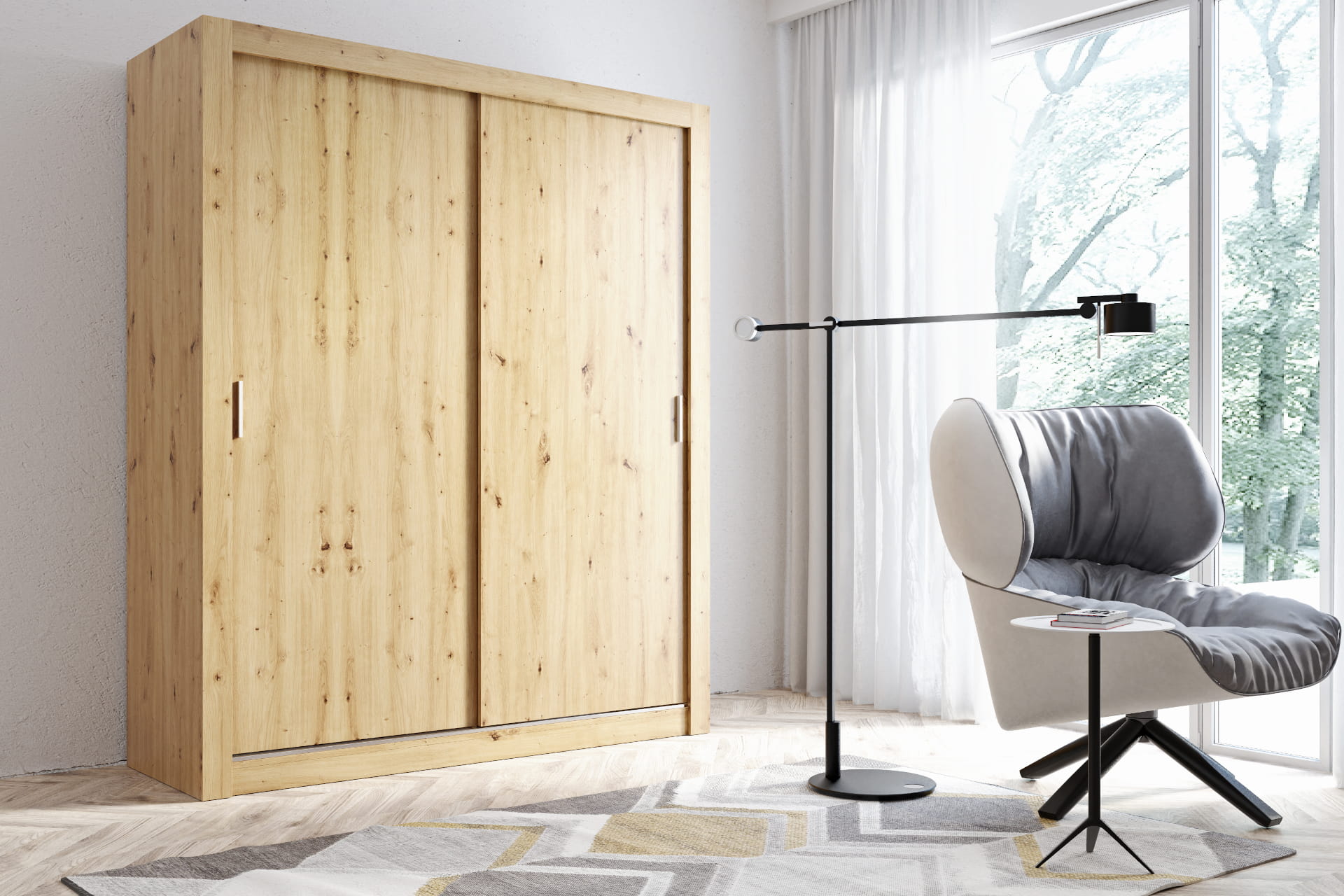 Szafa przesuwna ubraniowa Monako Artisan gładka 160 cm - 2 drzwiowa, 200×160×64 cm / uchwyty drewniane, oświetlenie led