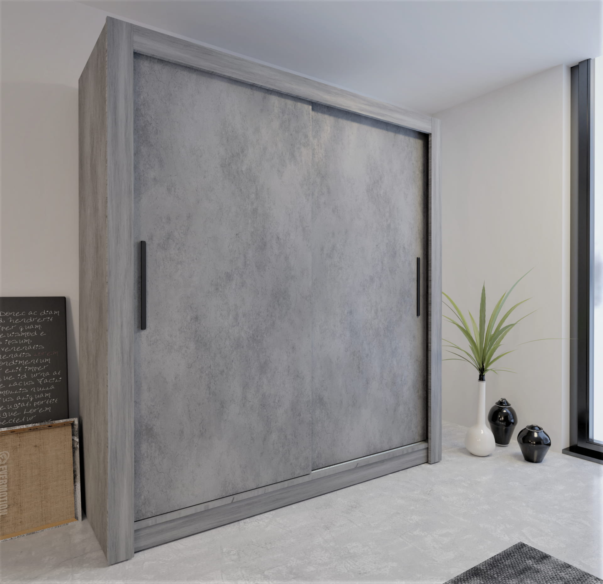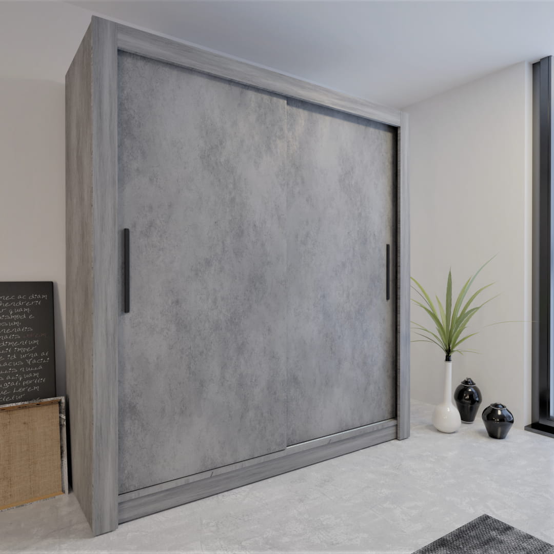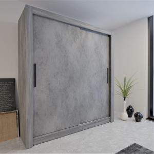 Szafa przesuwna ubraniowa Monako Beton gładka 160 cm - 2 drzwiowa, 200×160×64 cm / uchwyty drewniane, oświetlenie led