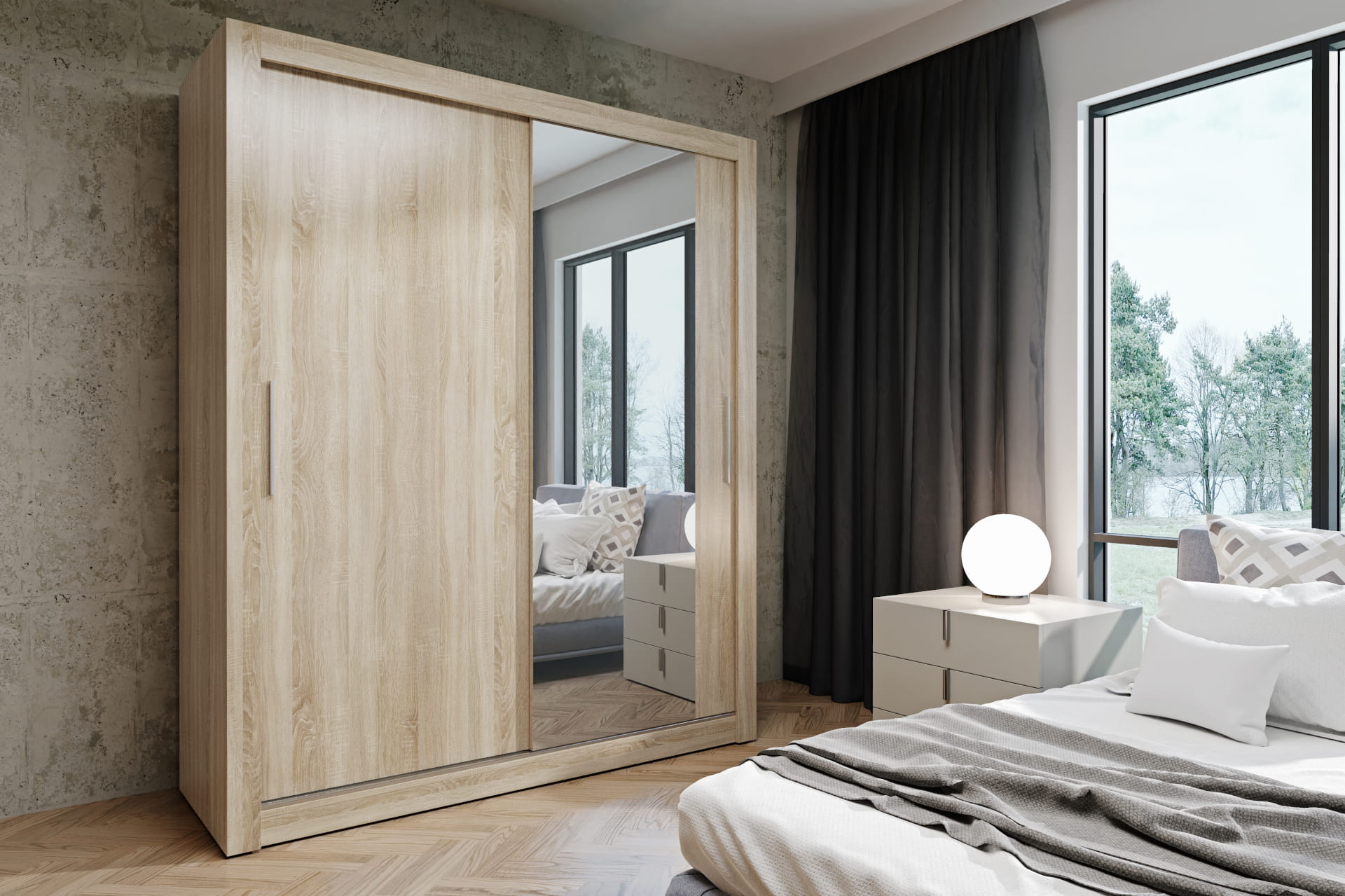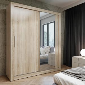 Szafa przesuwna ubraniowa Monako Sonoma gładka 160 cm - 2 drzwiowa, 200×160×64 cm / 1 lustro 185x60 / uchwyty drewniane, oświetlenie led