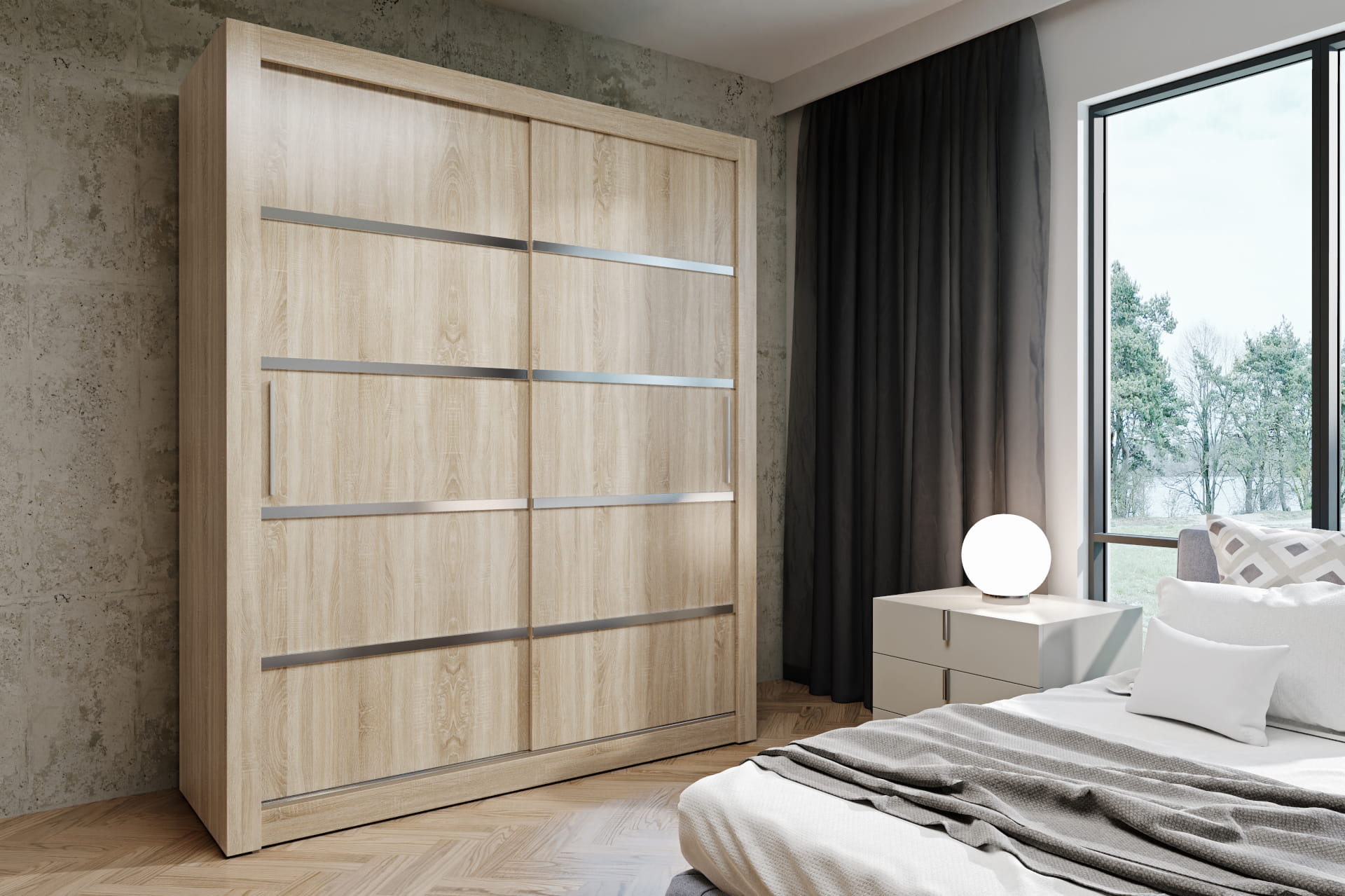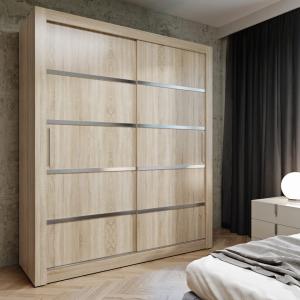 Szafa przesuwna ubraniowa Monako Sonoma z srebrnymi listwami 2D 160 cm - 2 drzwiowa, 200×160×64 cm / uchwyty drewniane, oświetlenie led