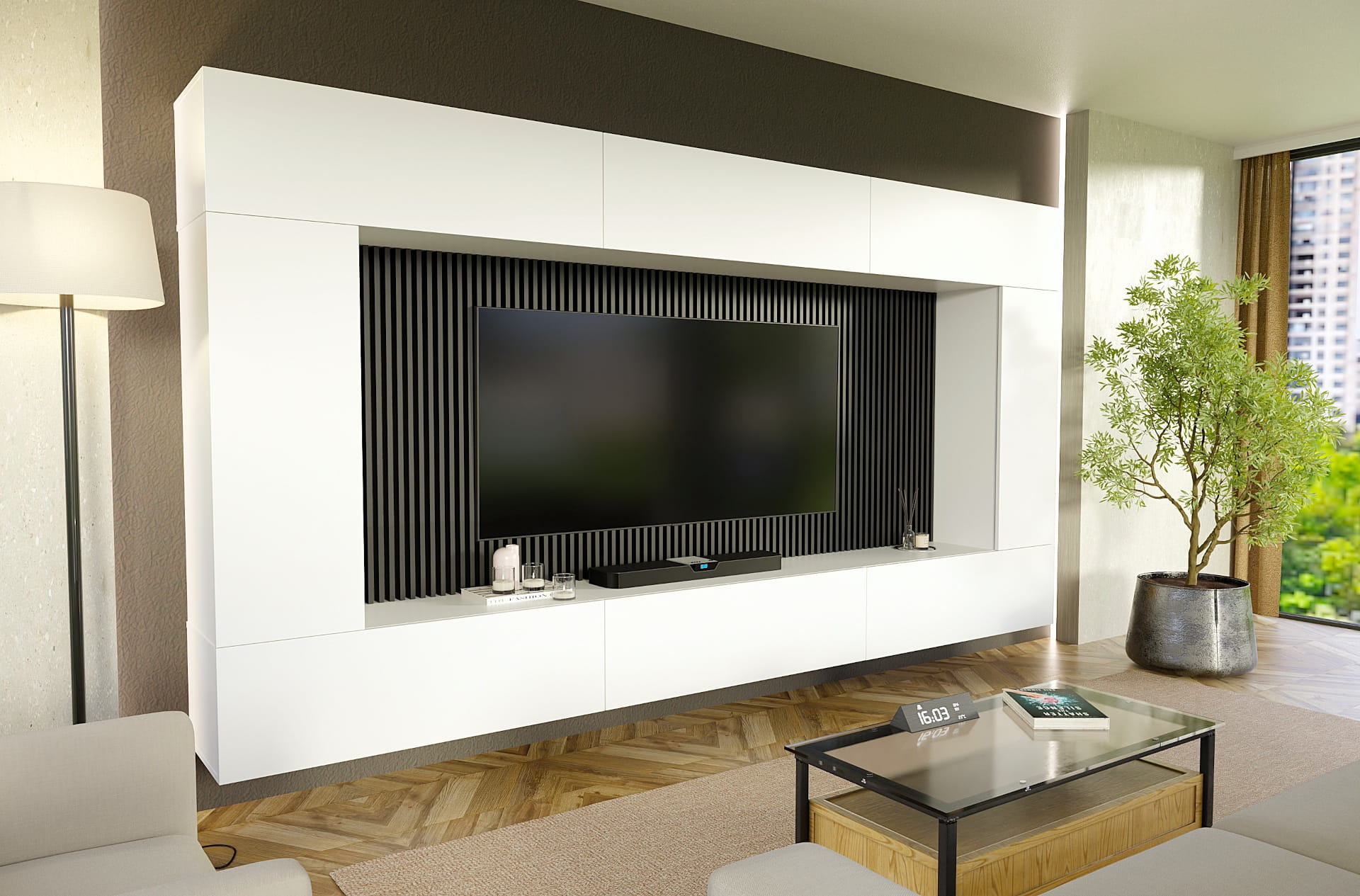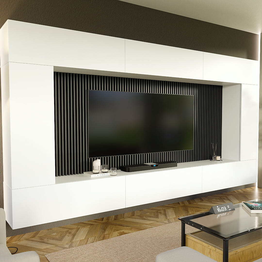 Zestaw meblościanka Volta Biała - nowoczesna ścienna aranżacja z 8 modułów, szerokość 276 cm, push-to-open